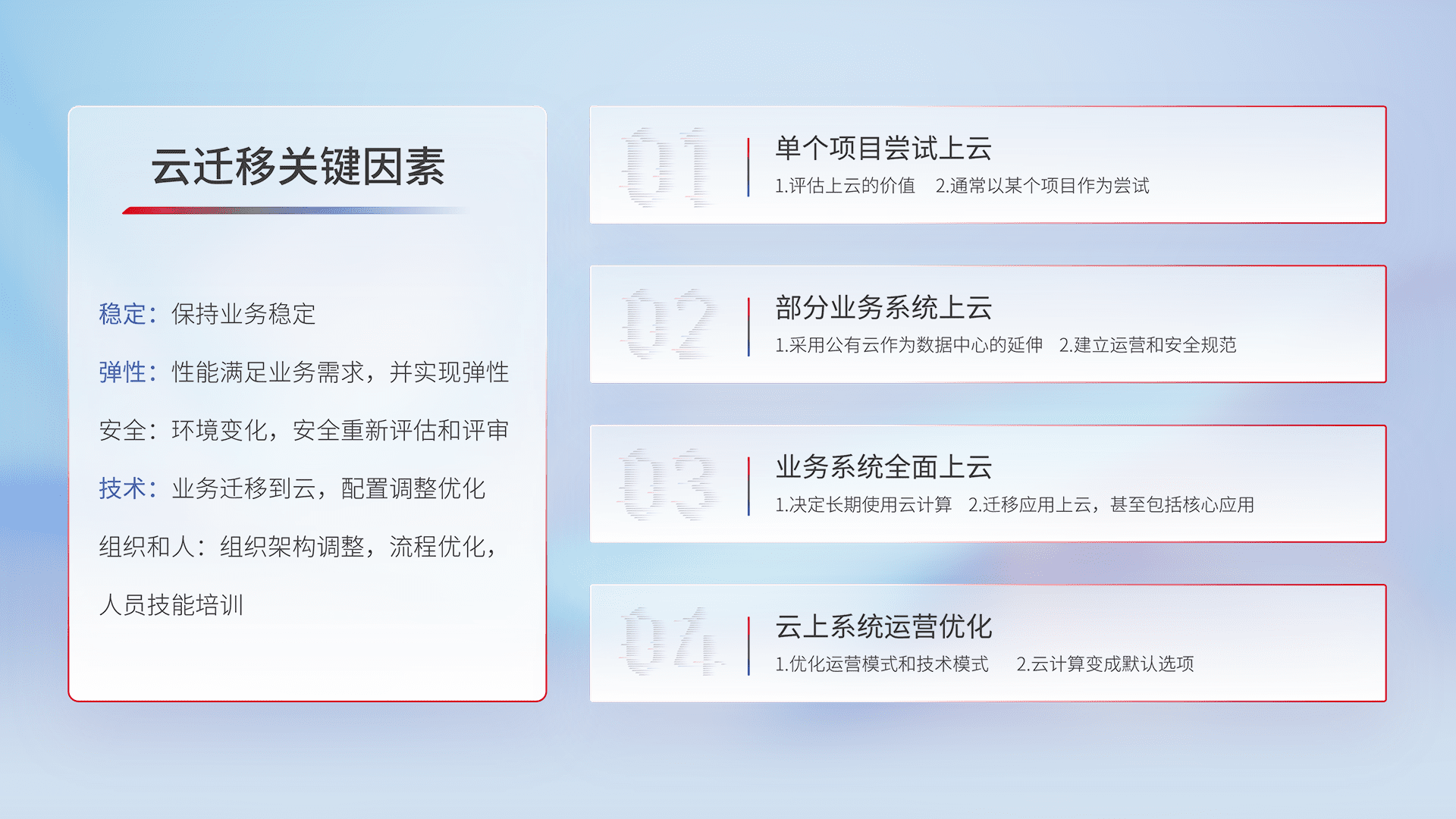 结合实际业务,,从规划设计、、云平台选型、、、云原生改造、、数据迁移、、集成交付,,,迁移全过程为客户识别最佳上云路径,,做好风险识别管理,,设计网络架构、、、、身份权限、、、、安全审计合规、、、、操作审计、、日志审计、、监控告警策略、、、多站点容灾设计等,,,对云上基础设施进行整体规划,,,,提升IT治理水平,,,,以满足弹性、、、高可用、、、、高性能的需求。。